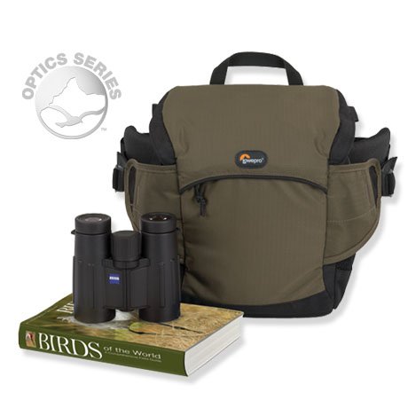 I've been a birder since 1978. I have a Lowepro camera bag, so when I saw this on Vine I thought it would be a good thing... it is. As with my other Lowepro, the construction cannot be faulted. It's sturdy, comfortable to wear, ergonomic, and the overall space is adaptable to varying book and binocular sizes via Velcro fasteners. I easily fit my Fujinon 7x50 Polaris F-SX Marine Waterproof Binoculars w/ comfort strap, Fujinon 7x50 7107502 if I remove the Quick Shelf, but they're heavy and I use them for astronomy, and the quick odd bird I might want to see out the back door. My Nikon 7496 Eagleview Zoom 8-24 X 25mm Binoculars (Black) fit well into the binocular pouch, and I can add a book (or 2) and...